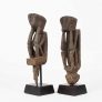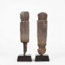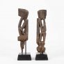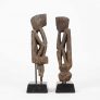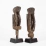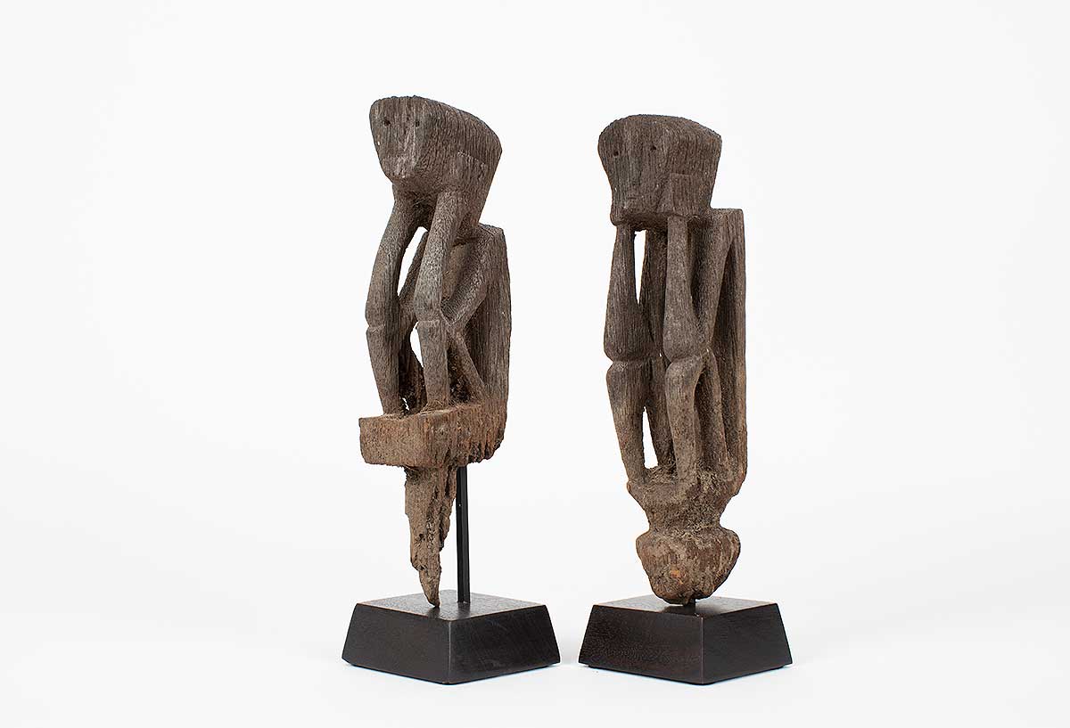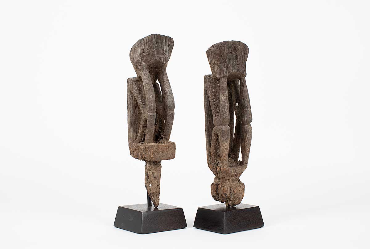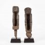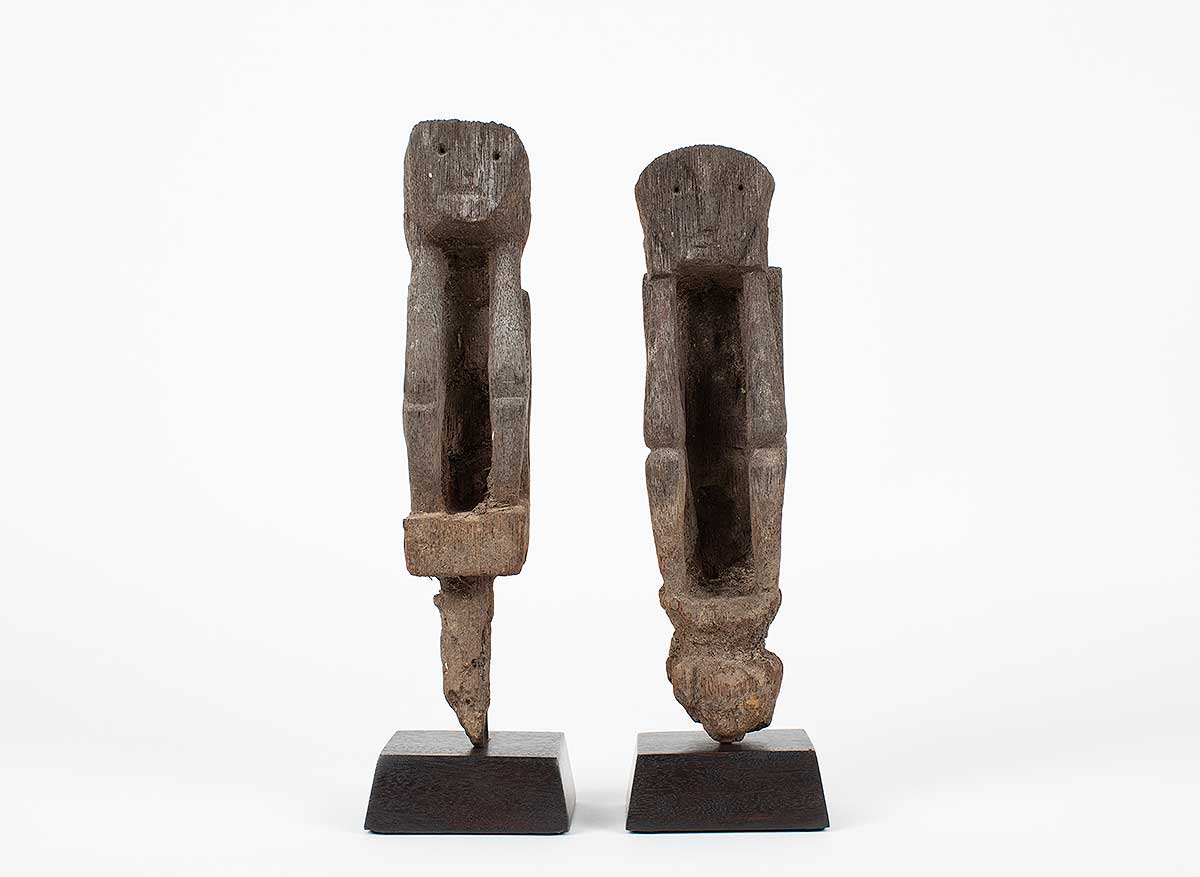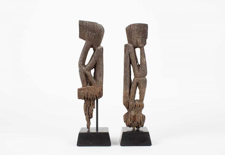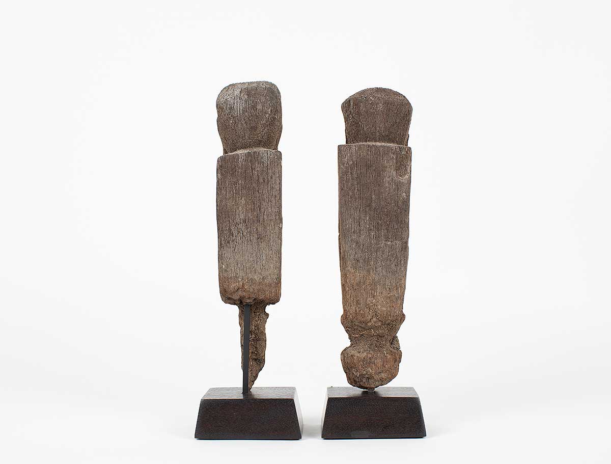 “Reminiscent of German expressionism; these rice protectors have a stark and intriguing quality. One figure has a wonderful heart shaped face with an elongated body; the other has a projecting head with a more tightly carved body. Both have good use of negative space in their torsos and they each exhibit a patina from decades of outdoor use. The peg extensions have been eroded away with time; but the ancestral images remain in great condition.”
