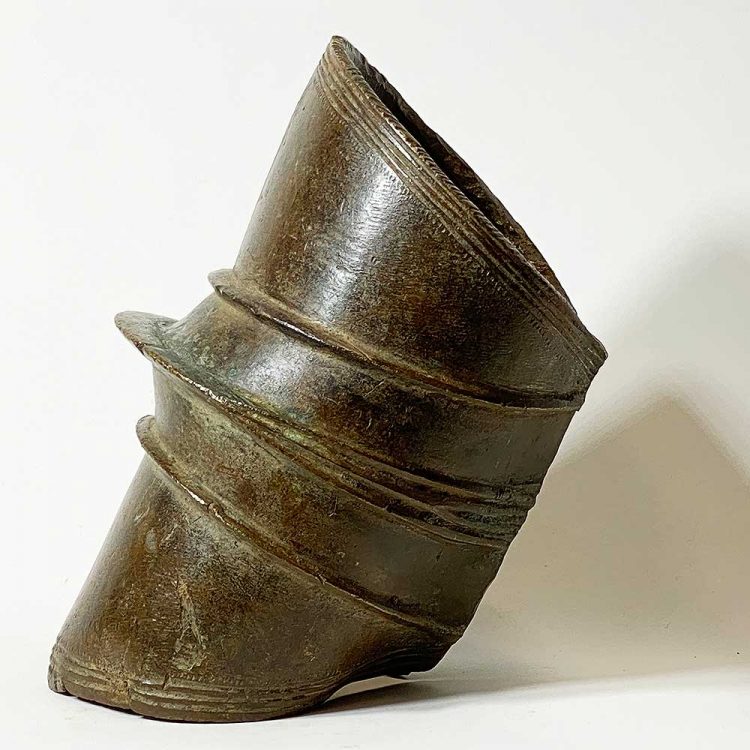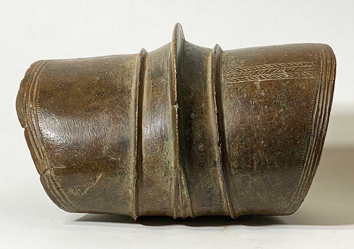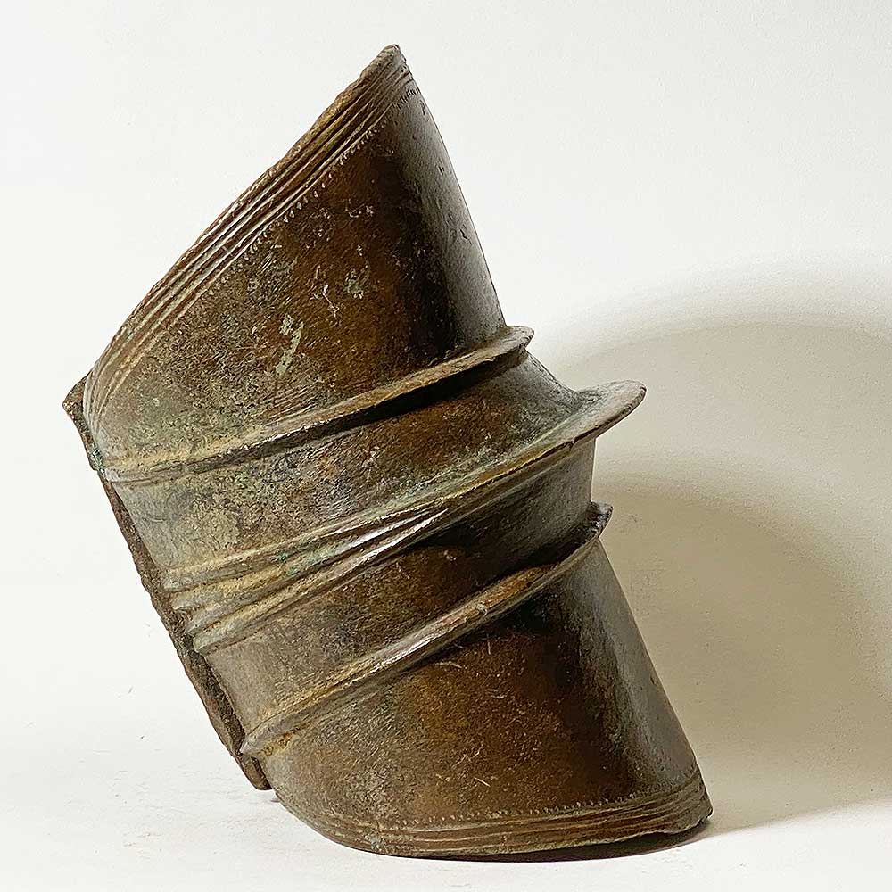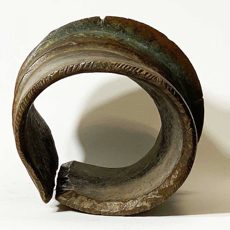 Massive prestige ornaments such as this heavy anklet served as an indicator of wealth since they attest to the fact that the owner did not have to perform any physical labor. The copper alloy was puddle cast in the ground and then curved into the form of a cylinder. A mat of vegetable fiber protected the wearer’s leg and foot.