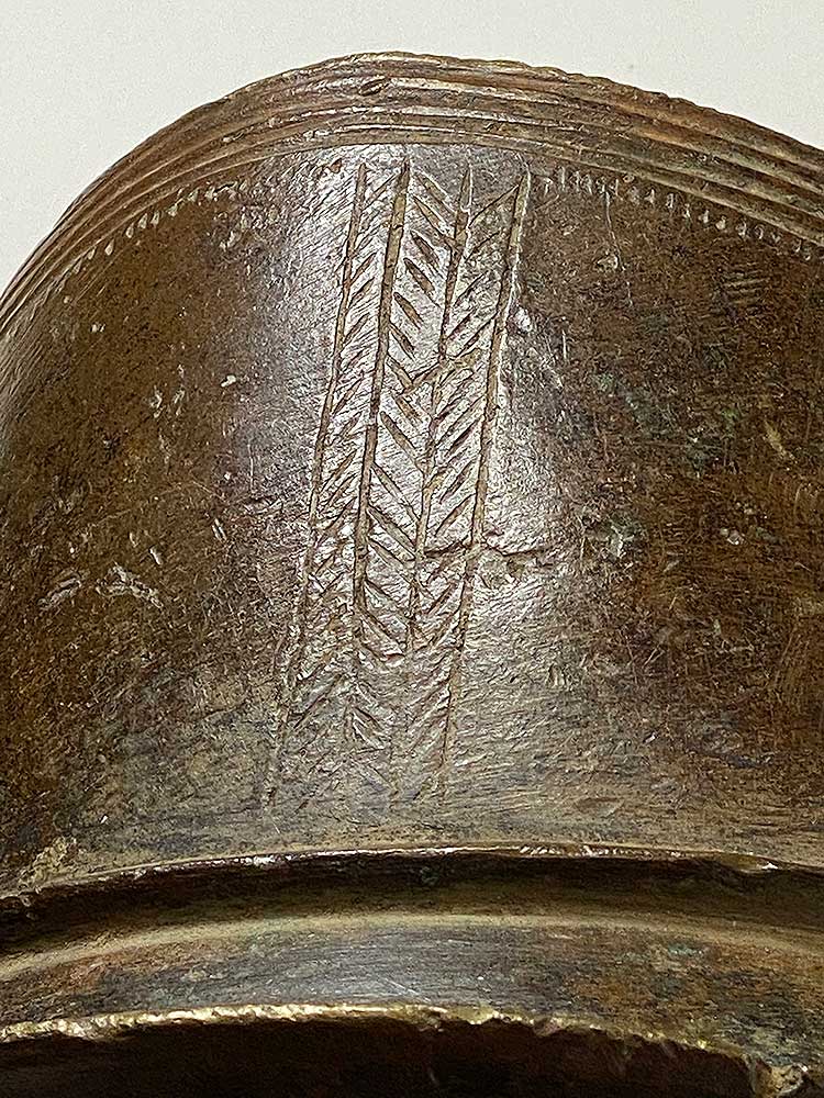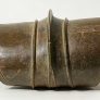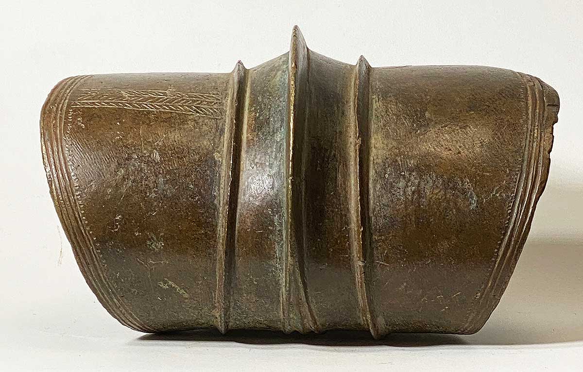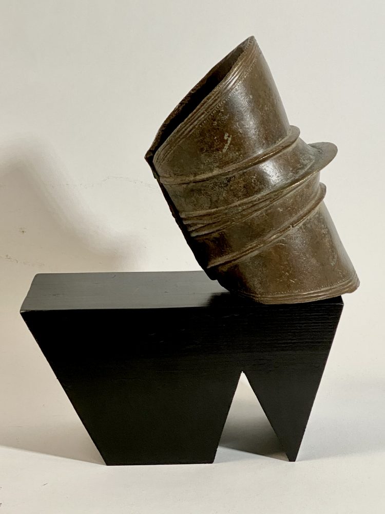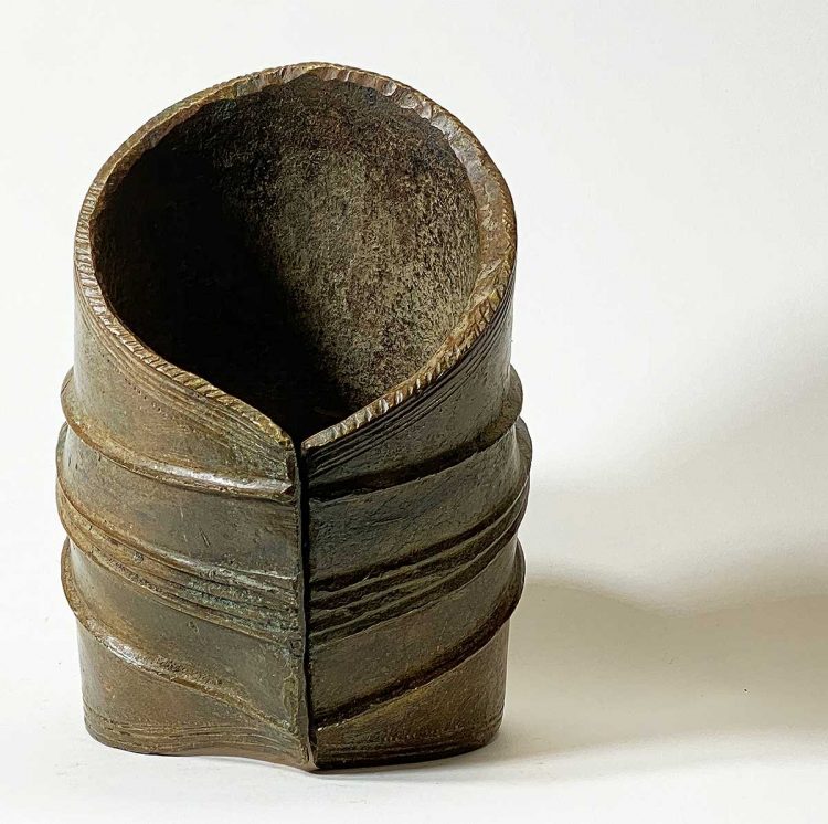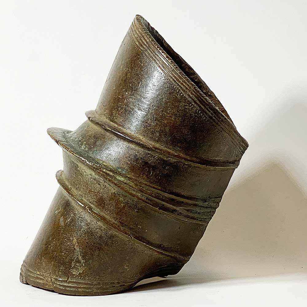 Massive prestige ornaments such as this heavy anklet served as an indicator of wealth since they attest to the fact that the owner did not have to perform any physical labor. The copper alloy was puddle cast in the ground and then curved into the form of a cylinder. A mat of vegetable fiber protected the wearer’s leg and foot.