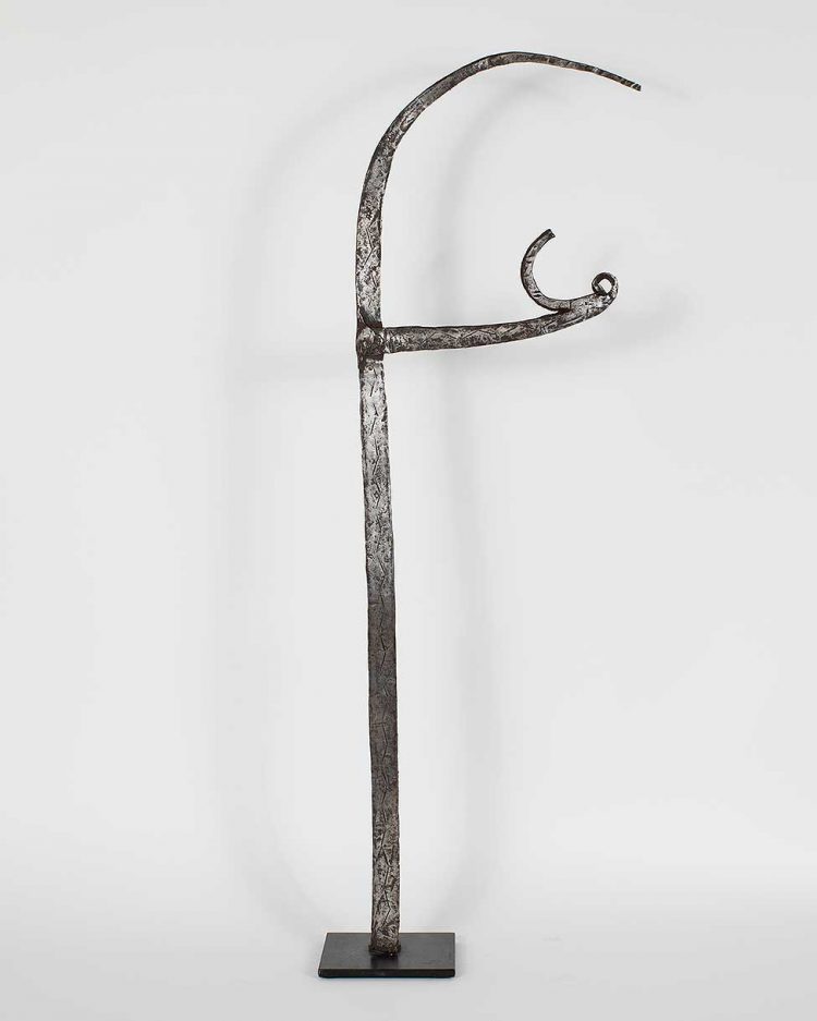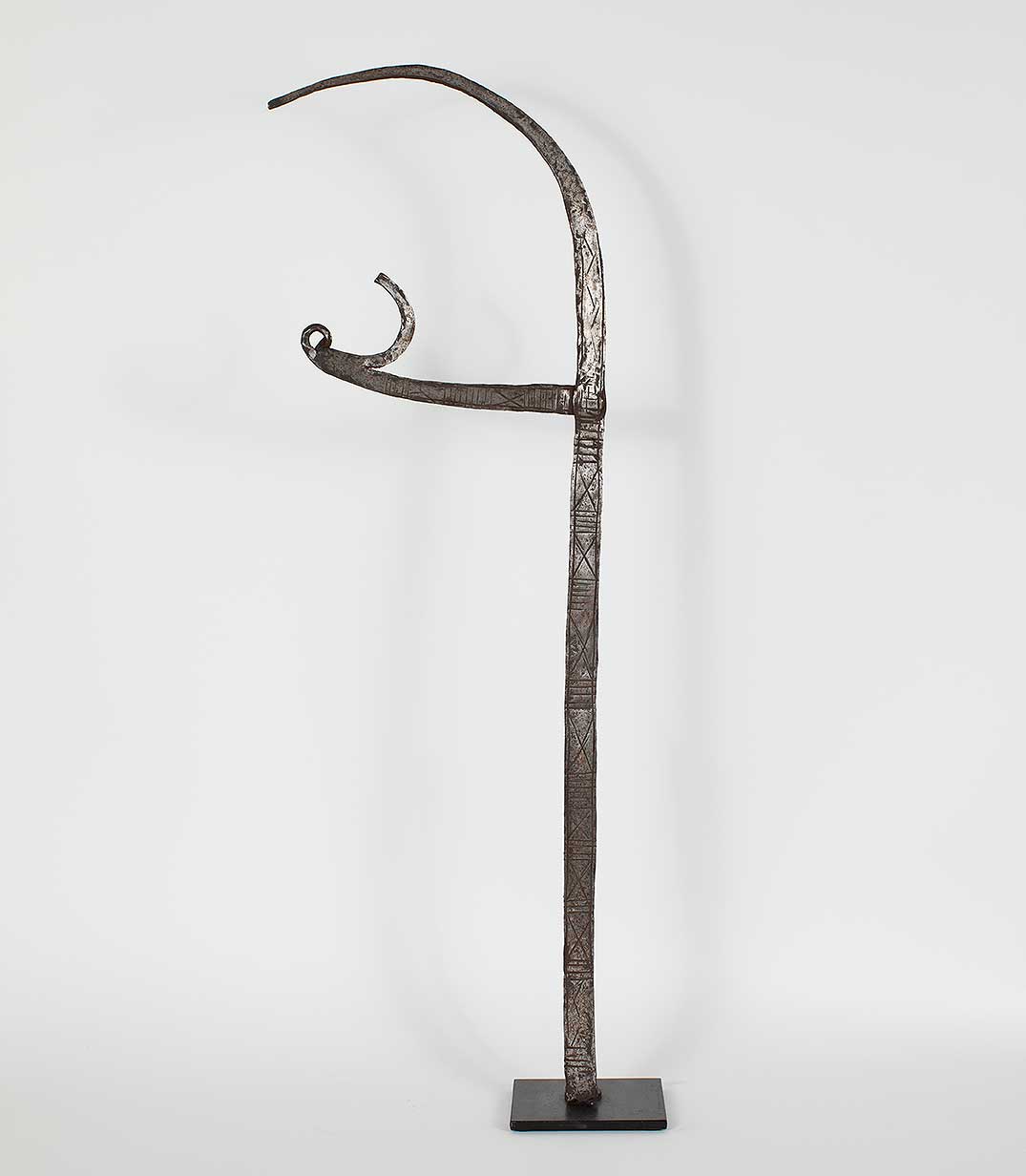 While inspired by the large F-shaped throwing knives from Cameroon, Central African Republic, Chad, and Sudan, this piece was certainly not designed for such use. With deliberately dull edges and a generally delicate construction, this type could have only functioned as a ceremonial object or currency object. Unfortunately, research on this uncommon type is insufficient. Interestingly, the incisions bear the characteristic mark of the incisions of Fur blades from Sudan – a stamped or rolled pattern that is both distinctive and not found elsewhere.