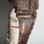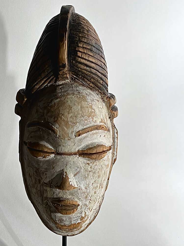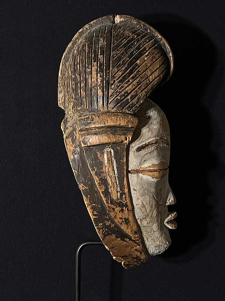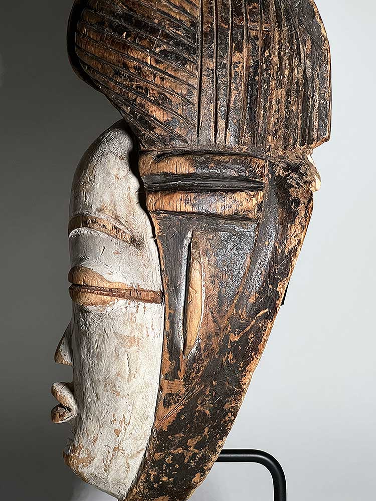 This is an unusual example with the line bisecting the eyes. Decorative lines are usually found in relief on the forehead or across the nose, but in this case, the line has been carved into the face.