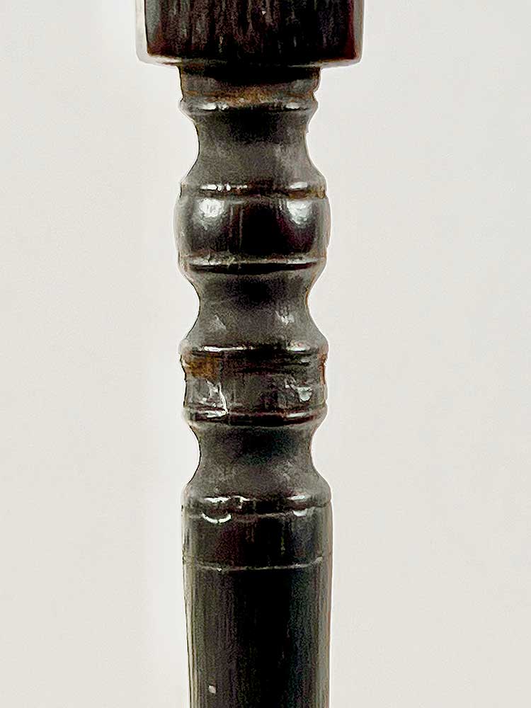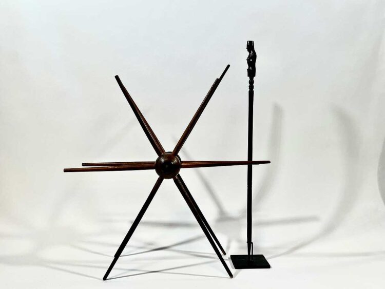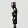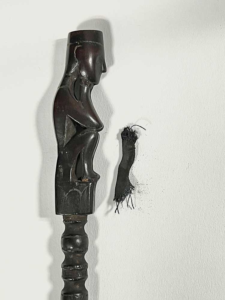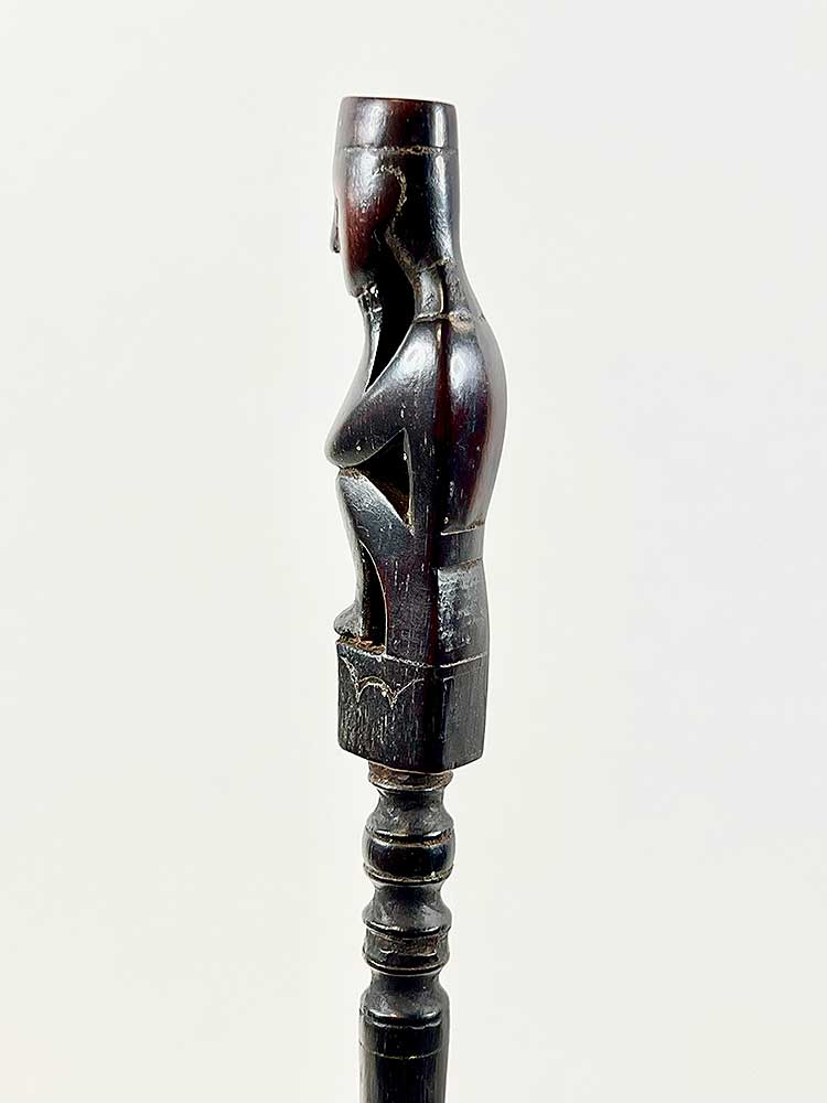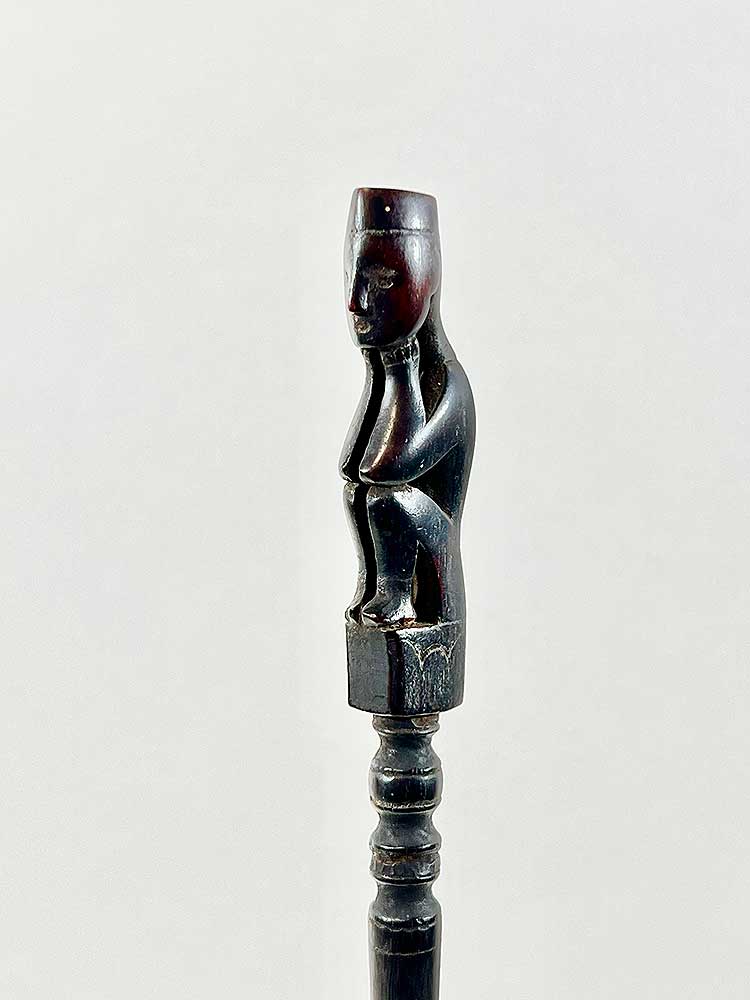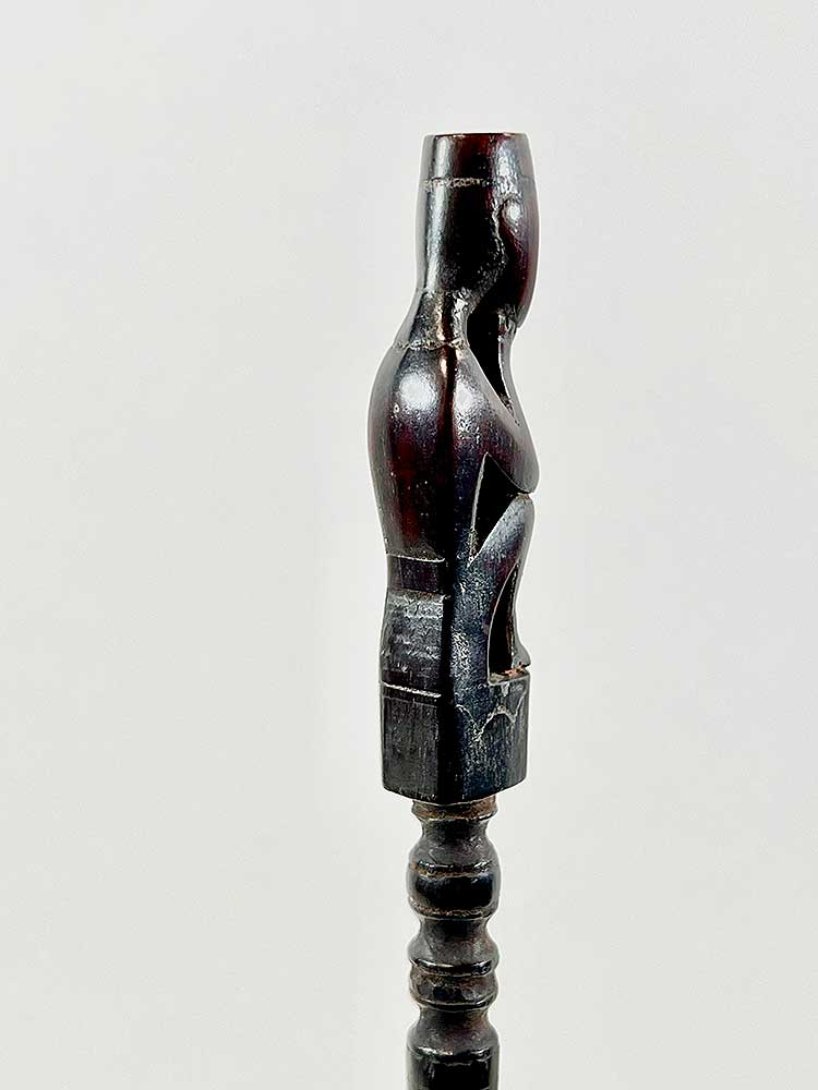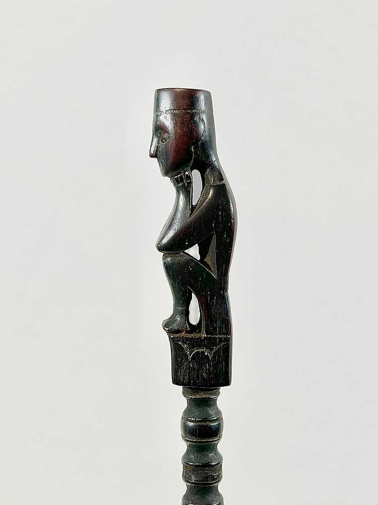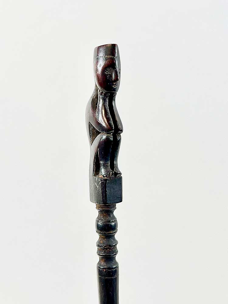 Tuntun are measuring sticks used when setting up traps to catch wild pigs. The trap includes a bamboo spear and a rattan spring, which is triggered by a wire. The angle of the spear is determined with the help of the tuntun. The small figure at the top of each stick holds magical substances to help attract the animal.