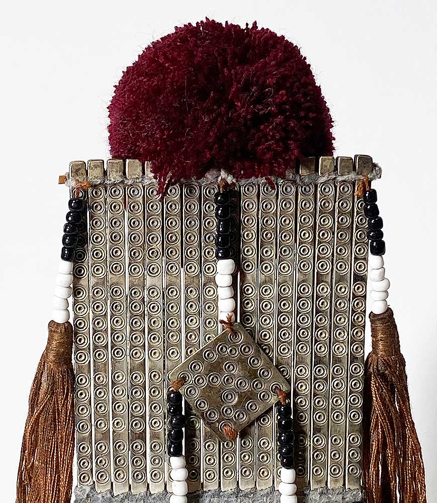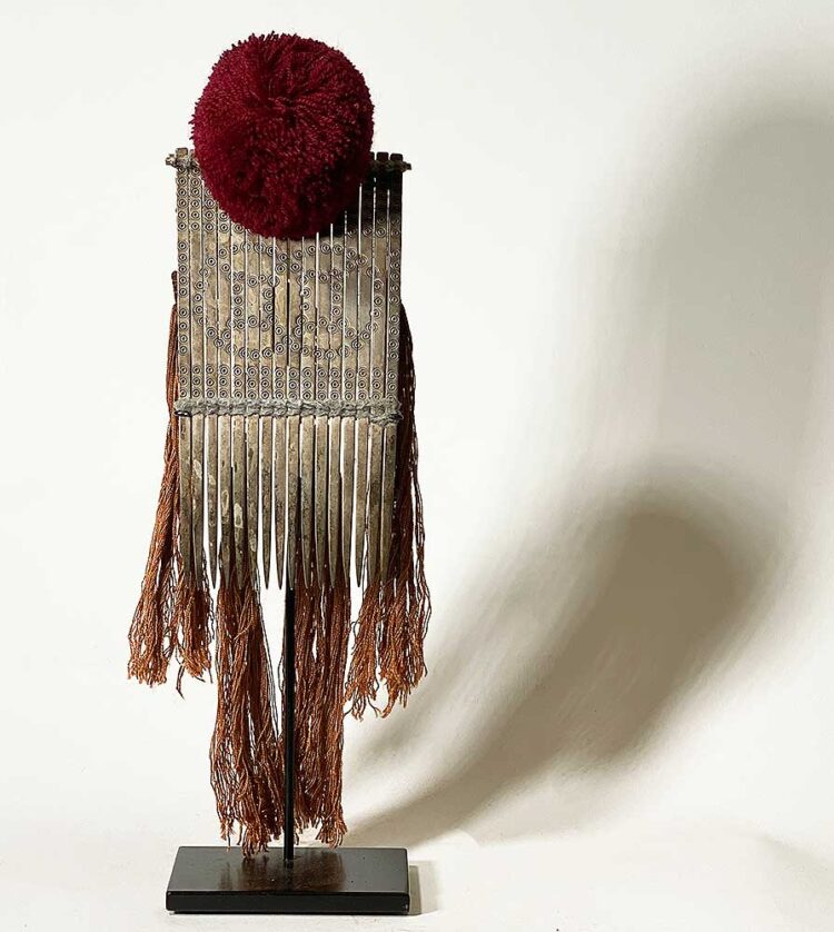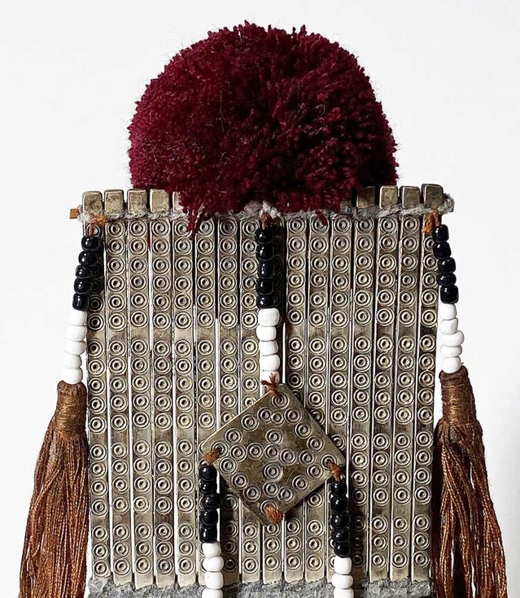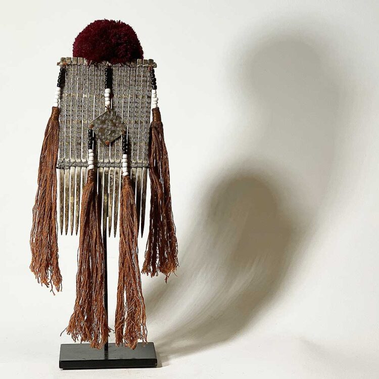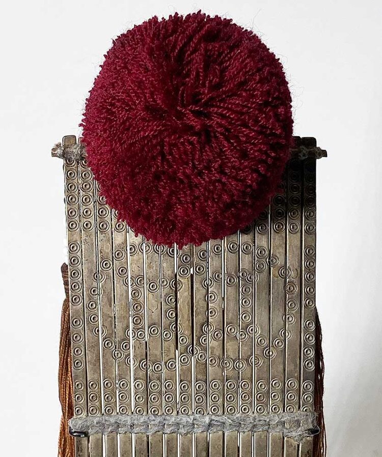 Silver comb with a dark red cotton pompom and brown twisted silk dangling threads with black and white glass trade beads.