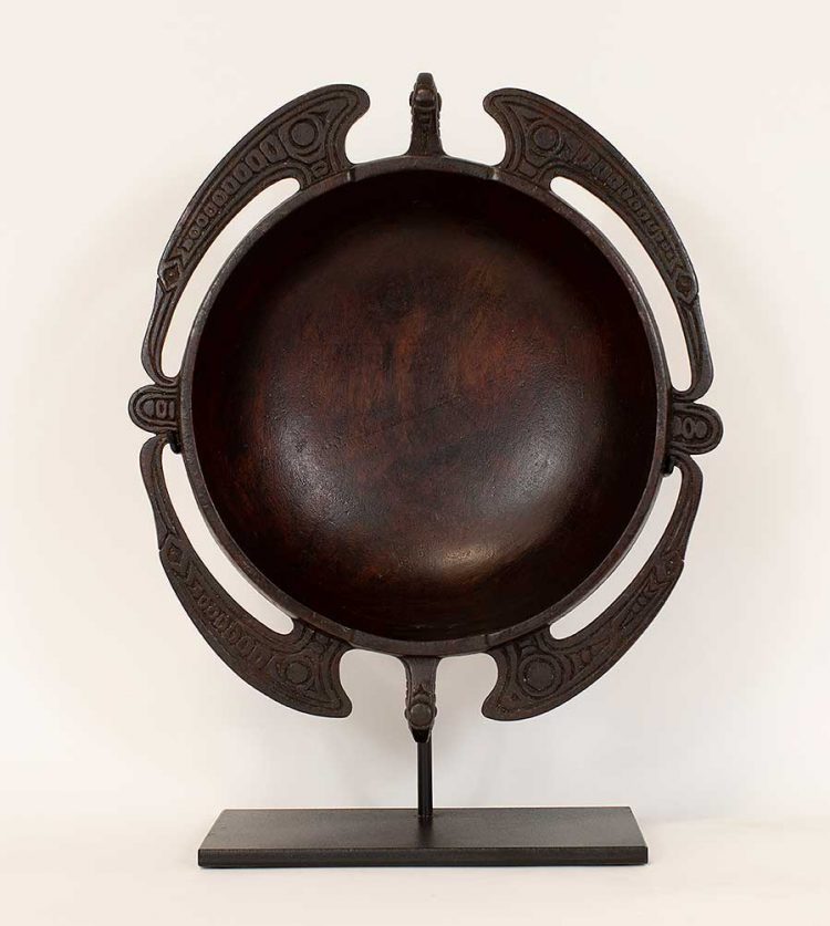 This is a contemporary version of a Tami Island ceremonial bowl. Bride-wealth gifts exchanged at marriage ceremonies, these intricately carved hardwood bowls were used for food distribution at feasts and rituals.