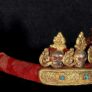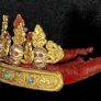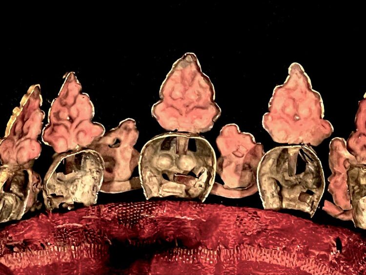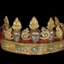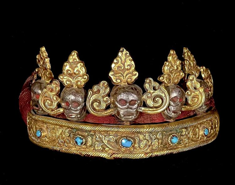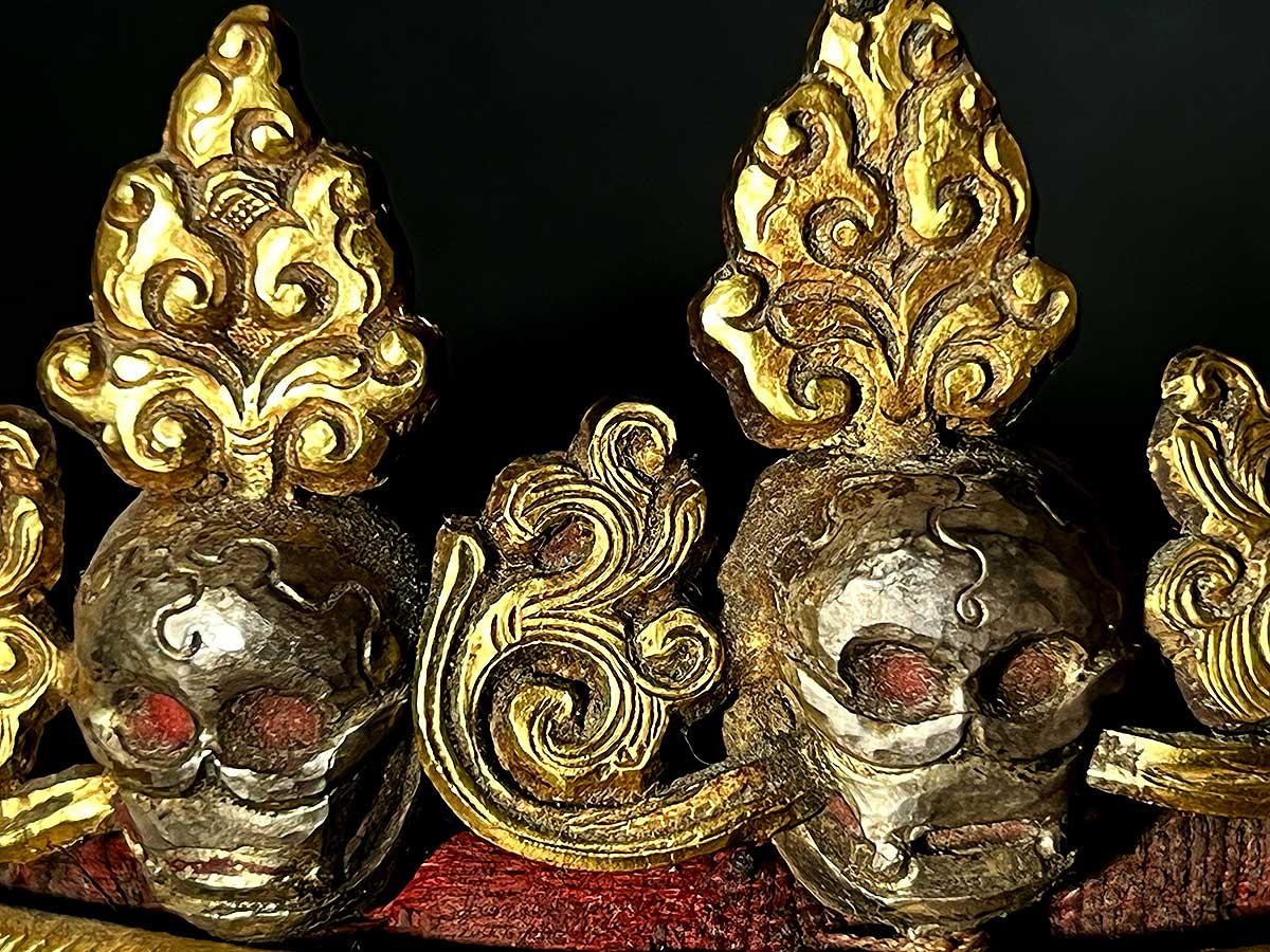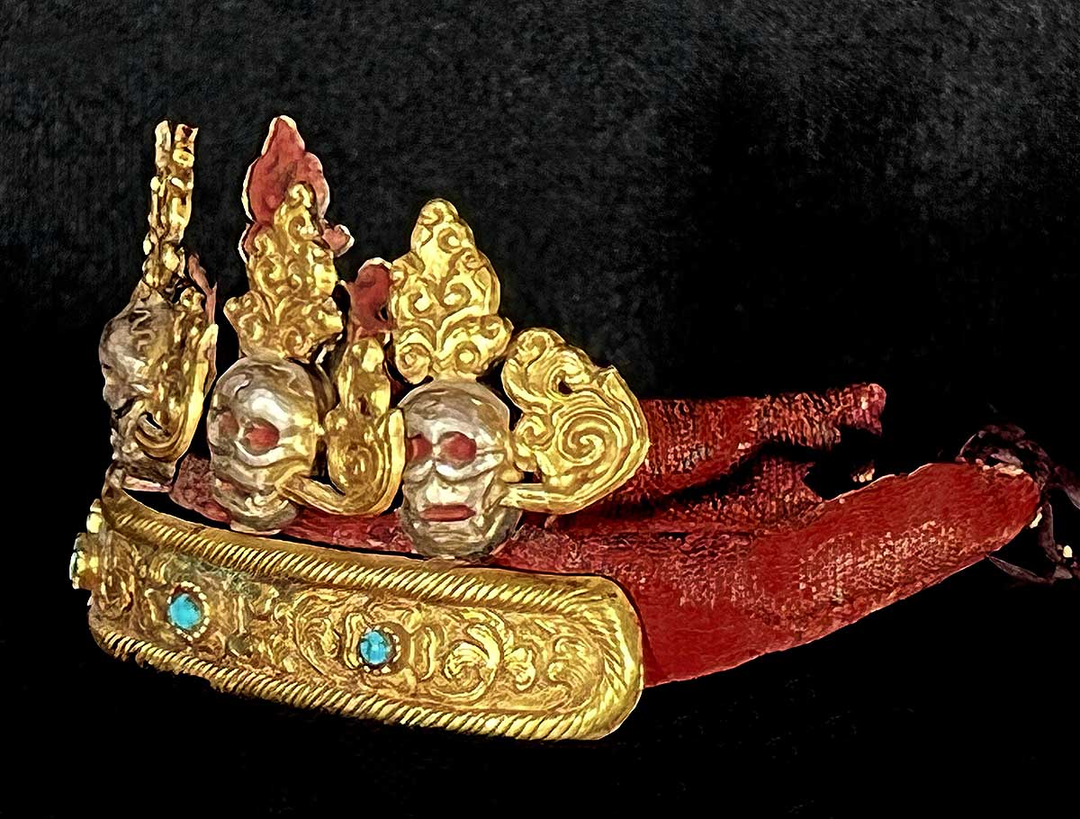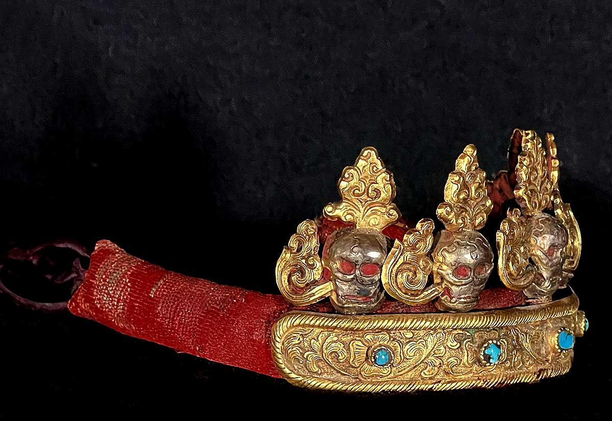 Elegant yet slightly macabre ornaments like this would have been worn by oracle-priests or by lamas during special rituals when they were dressed as bodhisattvas. This small one was most certainly used for a statue of a protector-deity of the oracle-cult.