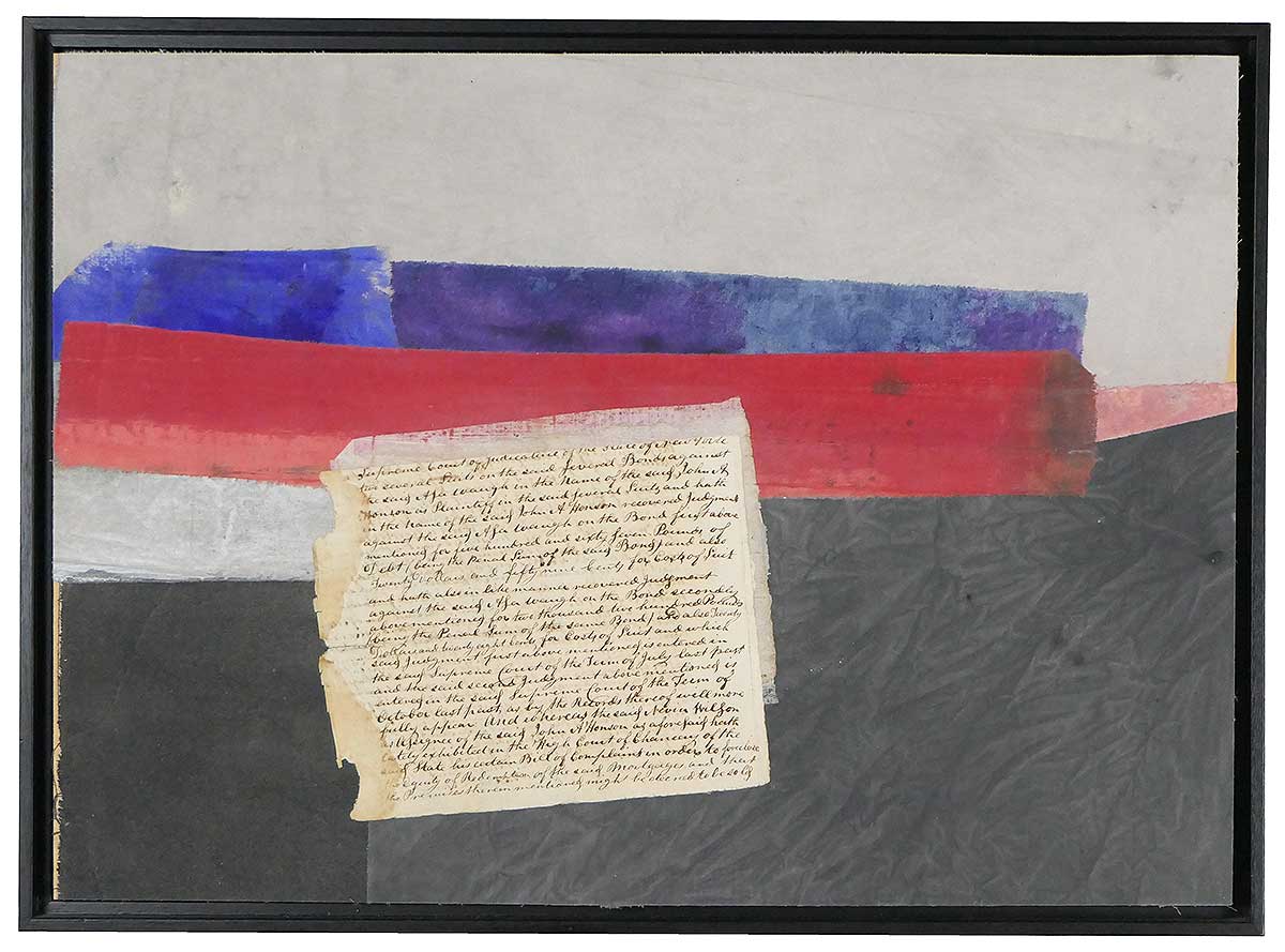 Simmons achieves a nice balance between the delicate details of a finely written document and the large colored geometries of the abstracted landscape behind it.