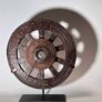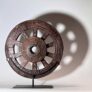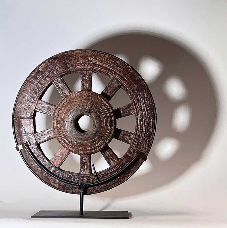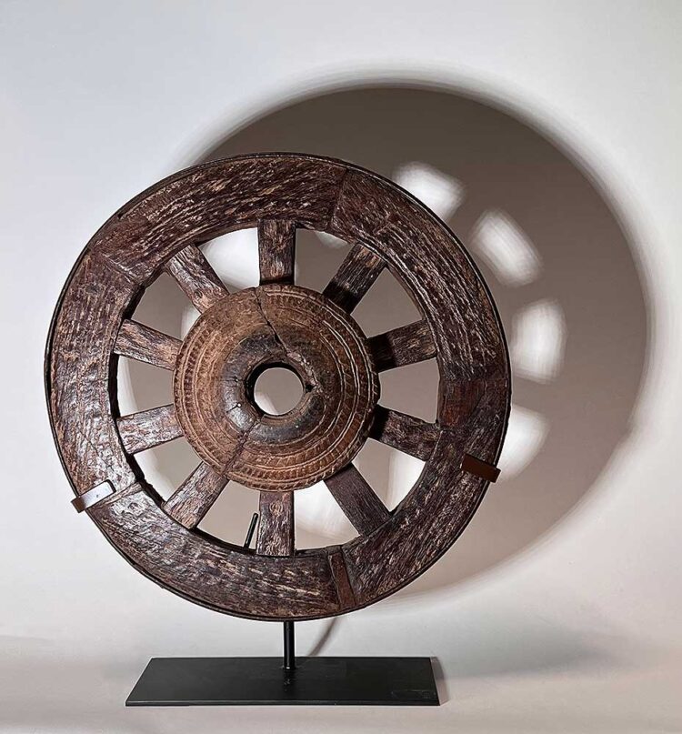 This small iron-rimmed wheel, carved with now eroded patterns, was made of extremely hard, heavy wood. One spoke has been replaced.