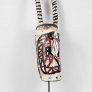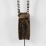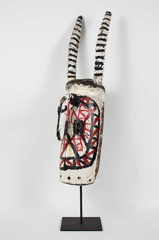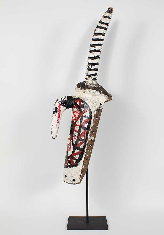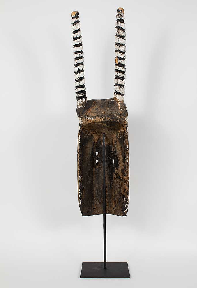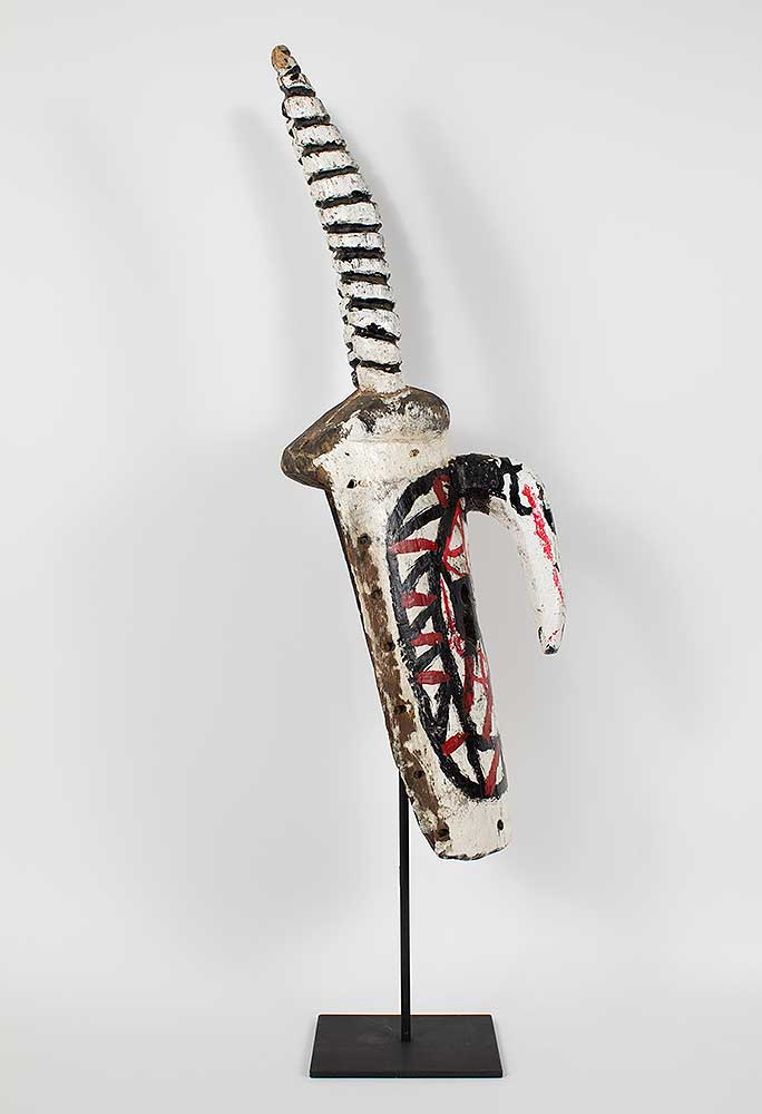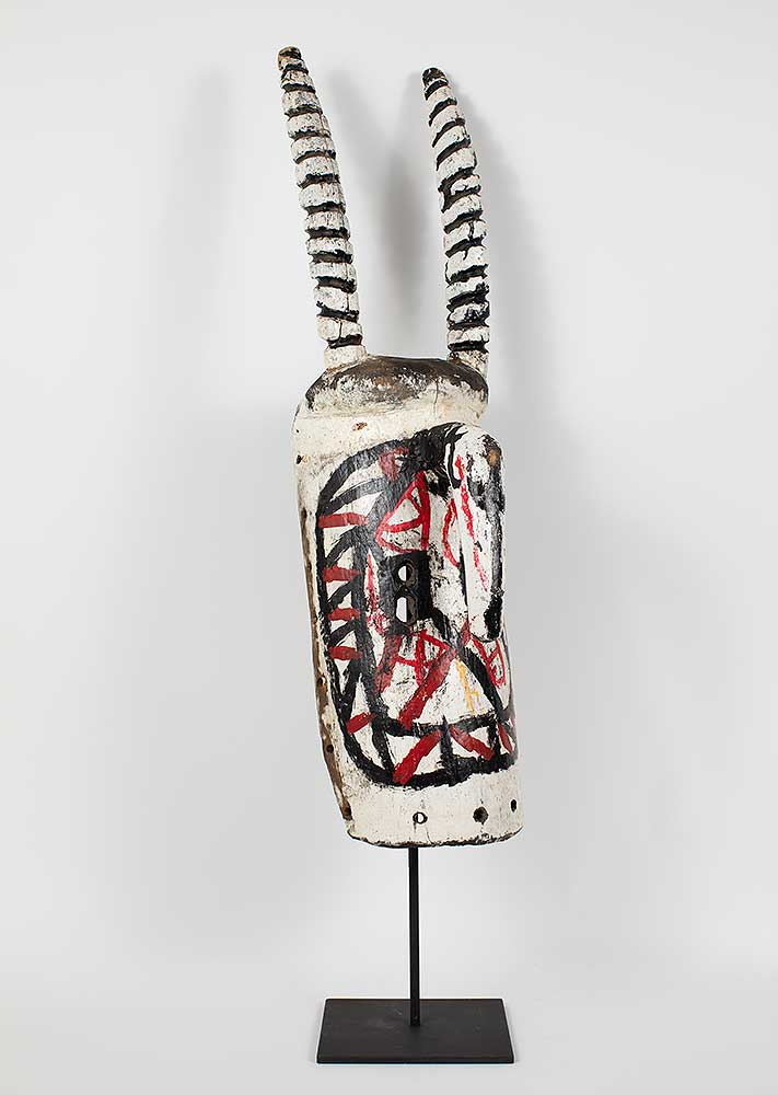 “The rarest and most important masks are called yali. Two horns project upward on each side of the face. The mask is worn with a carefully tailored, three-piece fiber costume that so completely covers the wearer that only the soles of his feet are exposed . The costume consists of a pair of trousers, a shirt that hangs to the knees, and a cowl that is attached to the mask and falls around the wearer’s shoulders. All three pieces are constructed on a close-fitting knotted fiber foundation garment, into which are tied masses of long fibers that are clipped short so that the ensemble resembles a deep-pile shag rug.The yali is short; usually less than five feet (1.5 m.); because it is intended to represent a dwarf spirit from the bush. Of necessity it is worn by a small boy, although the Mossi never admit this.”
